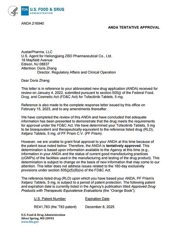 5月26日,珍寶島藥業(yè)發(fā)布公告,公司收到美國食品藥品監(jiān)督管理局(簡稱“美國FDA”)的通知,珍寶島藥業(yè)向美國FDA申報(bào)的枸櫞酸托法替布片的新藥簡略申請(ANDA,即美國仿制藥申請)已獲得暫時(shí)批準(zhǔn)(暫時(shí)批準(zhǔn):指FDA已經(jīng)完成仿制藥的所有審評要求,但由于專利權(quán)或?qū)Yu權(quán)未到期而給予的一種批準(zhǔn)形式)。
